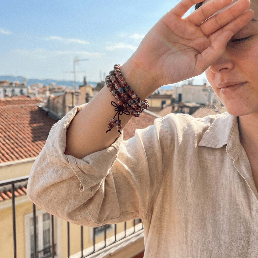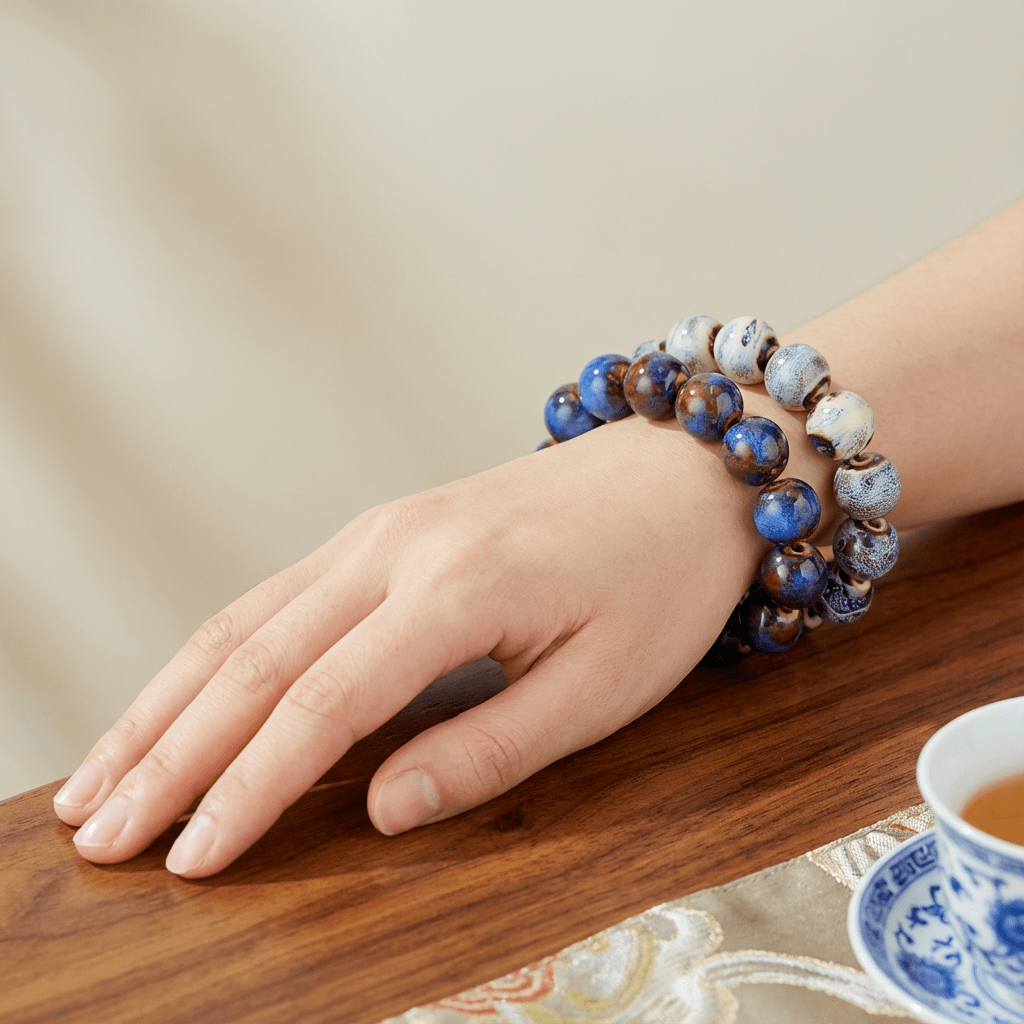 Inspired by traditional 108-bead malas and Chinese ceramic art, this bracelet wraps three times around the wrist, turning a classic...